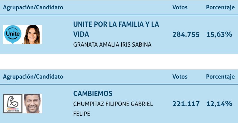 La tercera fuerza en Diputados quedó para «Unite por la Familia y la Vida», con Amalia Granata encabezando la lista. Con el 15,6%, alcanzó 284 mil votos y consiguió colocar seis diputados en la Cámara.