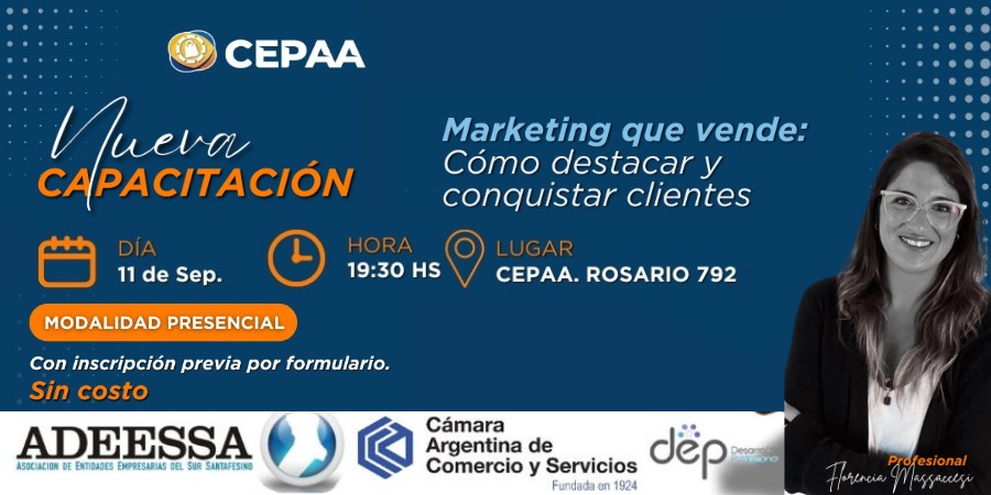 La capacitación, denominada “Marketing que vende: Cómo destacar y conquistar clientes”, se llevará a cabo el jueves 11 de septiembre, a las 19:30 hs., en modalidad presencial y con cupos limitados.