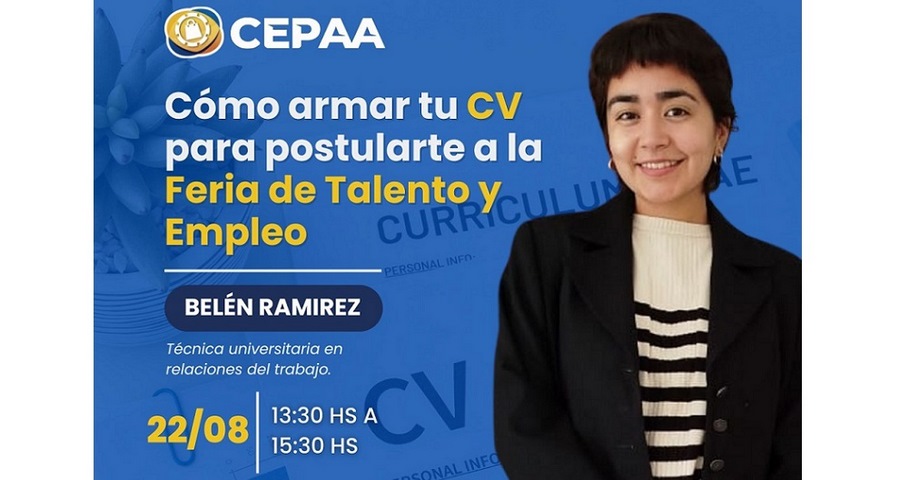 La misma, titulada “Cómo armar tu CV para postularte a la Feria de Talento y Empleo”, se desarrollará este jueves 22 de agosto, a partir de las 13:30 hs., en las oficinas de CEPAA, sitas en calle Rosario 792.