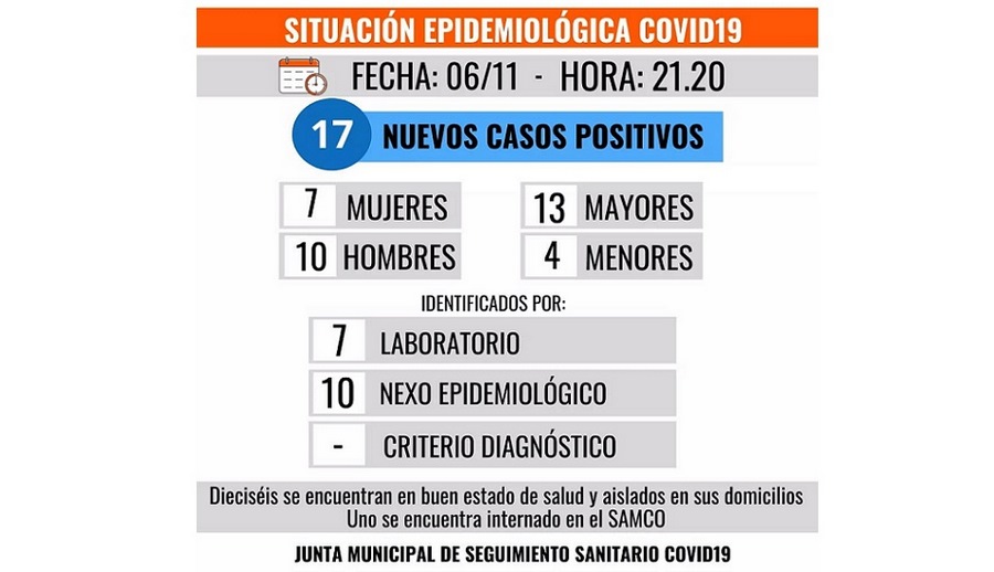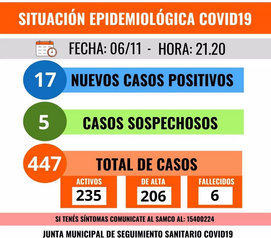 Cabe aclarar que, con estos 17, son 447 los casos confirmados en la ciudad. Teniendo en cuenta que 206 pacientes ya fueron dados de alta y que seis fallecieron, son 235 los que continúan activos.