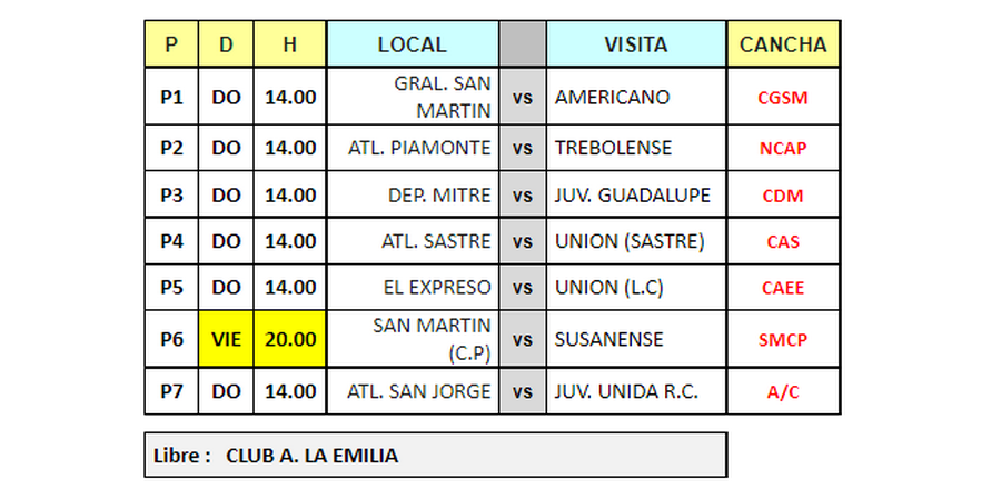 El resto de los encuentros, incluidos El Expreso vs. Unión Los Cardos en el “Gigante” y Piamonte vs. Trebolense en el oeste del departamento, irán el domingo en el horario habitual de cada fin de semana.