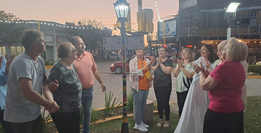 El farol, colorido y esbelto, lleva consigo dos placas dobles con un cálido homenaje a vecinos de la ciudad que vivieron en el barrio o que dejaron huella con su actividad profesional y cultural.