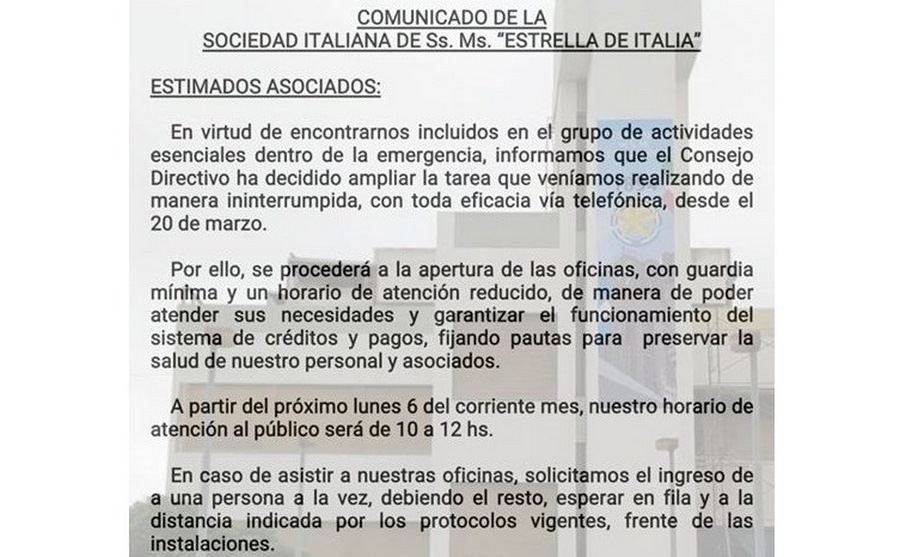 La Sociedad Italiana de Socorros Mutuos «Estrella de Italia» emitió un comunicado a los medios de prensa para informar la apertura de sus puertas de atención al público desde este lunes 6 de abril.