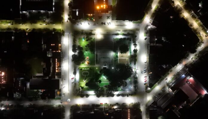 La intervención, incluyó la colocación de nuevas luminarias en el interior de la plaza, transformando su estética nocturna.