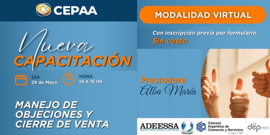 ¿Querés llevar tus habilidades de venta al siguiente nivel? Este jueves 29 de mayo, tenés una cita imperdible con el taller «MANEJO DE OBJECIONES Y CIERRE DE VENTAS», organizado por CEPAA.