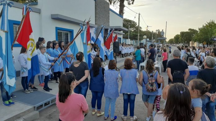 Tras la bienvenida, ingresaron las banderas de ceremonia y luego, se entonaron las estrofas del Himno Nacional Argentino, interpretado en Lengua de Señas por alumnos de sexto año de la Escuela Laprida.