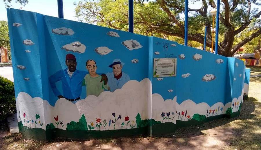 “Plaza… ya no tengas temor porque siempre tendrás la mirada atenta del que te riega, te poda, te limpia. Plaza… Ya no tengas temor, porque en los momentos que ellos no estén, los ángeles guardianes que una vez te cuidaron, desde el cielo lo harán”, reza la placa que acompaña a la pintura.